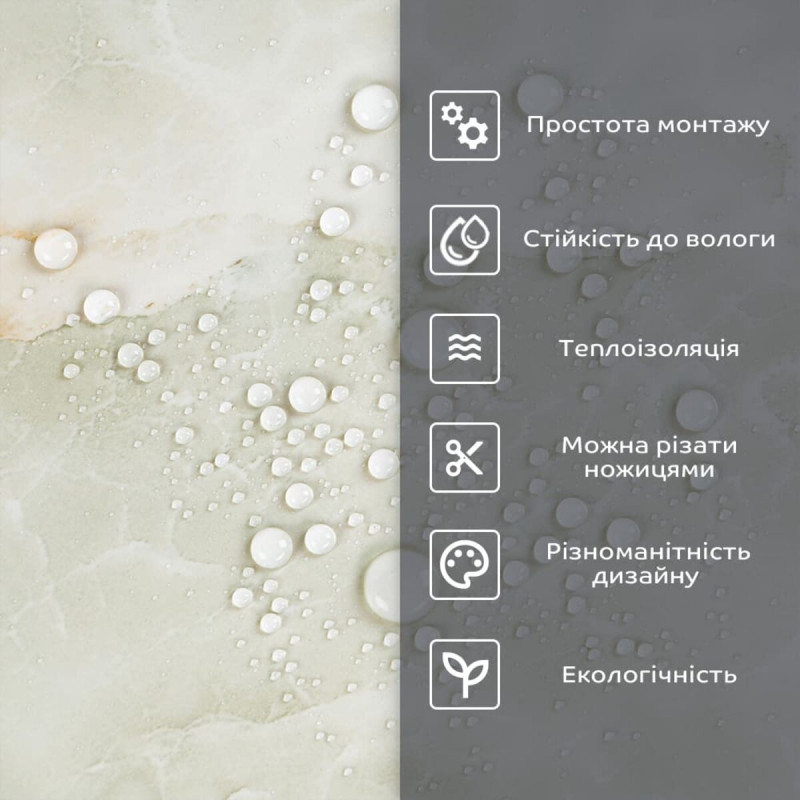 - 2. Стійкість до вологи: матеріал стійкий до впливу вологи та пари, а також до появи плісняви, що робить його придатним для використання у приміщеннях з високою вологістю, таких як ванни та кухні. Плитка підходить для створення фартуха кухні, можна клеїти біля плити на відстані не менше ніж 20-25 см;