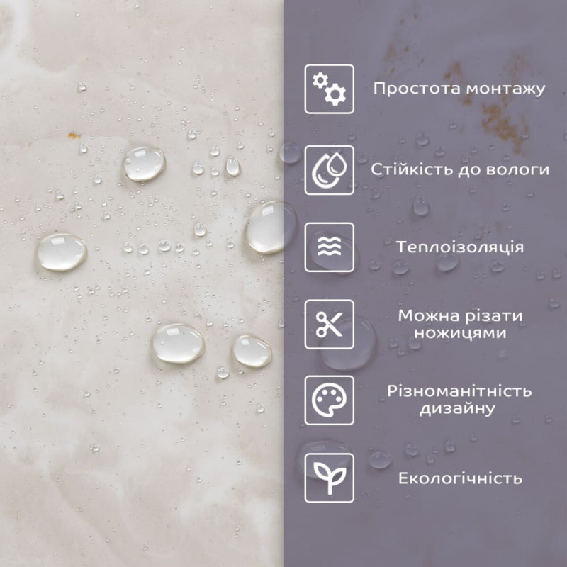 - 2. Стійкість до вологи: матеріал стійкий до впливу вологи та пари, а також до появи плісняви, що робить його придатним для використання у приміщеннях з високою вологістю, таких як ванни та кухні. Плитка підходить для створення фартуха кухні, можна клеїти біля плити на відстані не менше ніж 20-25 см;