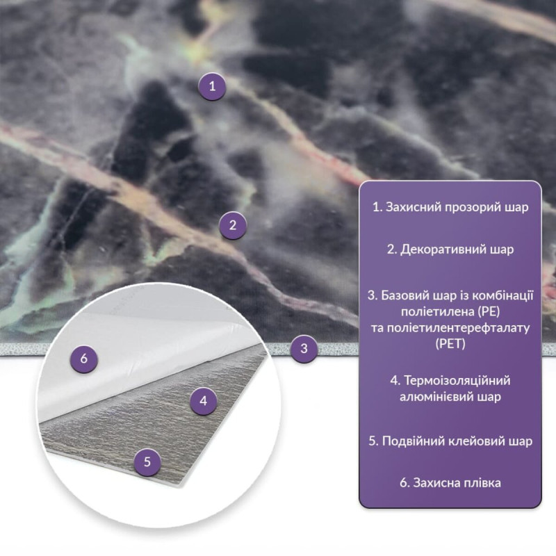 Як і в натуральних матеріалах, малюнки РЕТ плиток можуть трохи відрізнятися між собою, зберігаючи при цьому загальний дизайн та колір, що ще більше підкреслює природну імітацію. Також просимо взяти до уваги, що виробник має право змінювати зовнішній вигляд товару, зокрема відтінок та малюнок, на власний розсуд і без попереднього повідомлення.Шари матеріалу: