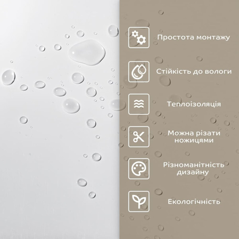 - 1. Легкість та міцність: плитка легка та міцна, що спрощує її логістику, установку та забезпечує довгий термін служби. Матеріал легкий в установці, можна різати ножицями чи монтажним ножем, не потребує додаткових матеріалів чи спеціалістів. Між смугами не розходиться, не роздмухується і не деформується. Відсоток обрізу становить 1%, що є найкращим показником для настінних покриттів;