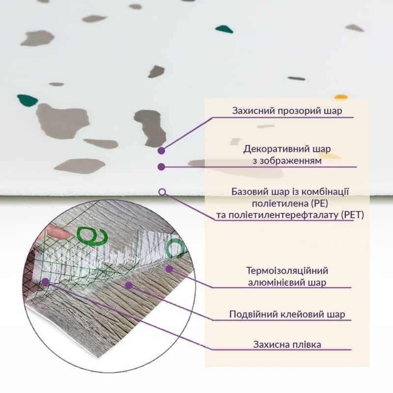 - 3. Ізоляція: плитка має звукову та теплоізоляцію завдяки наявності повітряних прошарків та додатковому алюмінієвому шару;