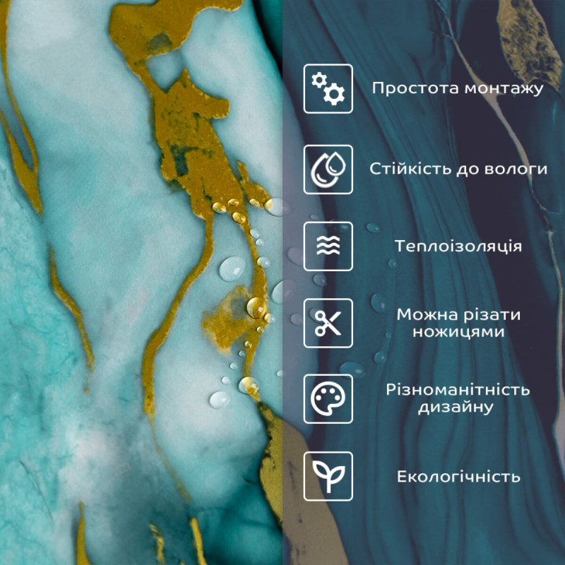 - 1. Легкість та міцність: плитка легка та міцна, що спрощує її логістику, установку та забезпечує довгий термін служби. Матеріал легкий в установці, можна різати ножицями чи монтажним ножем, не потребує додаткових матеріалів чи спеціалістів. Між смугами не розходиться, не роздмухується і не деформується. Відсоток обрізу становить 1%, що є найкращим показником для настінних покриттів;