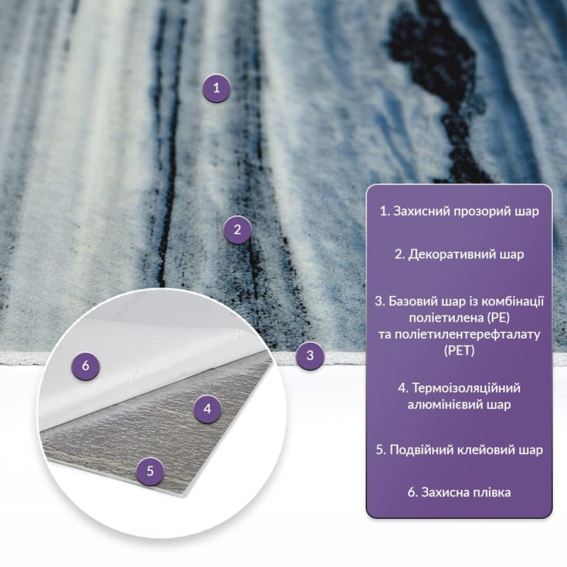 - 3. Ізоляція: плитка має звукову та теплоізоляцію завдяки наявності повітряних прошарків та додатковому алюмінієвому шару;
