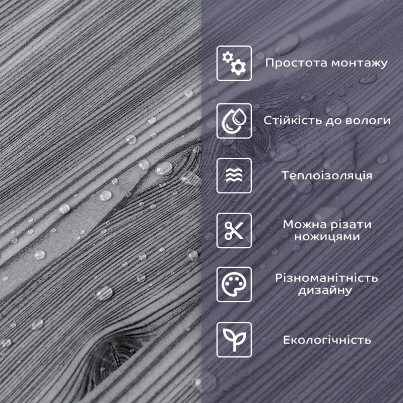 - 1. Легкість та міцність: плитка легка та міцна, що спрощує її логістику, установку та забезпечує довгий термін служби. Матеріал легкий в установці, можна різати ножицями чи монтажним ножем, не потребує додаткових матеріалів чи спеціалістів. Між смугами не розходиться, не роздмухується і не деформується. Відсоток обрізу становить 1%, що є найкращим показником для настінних покриттів;