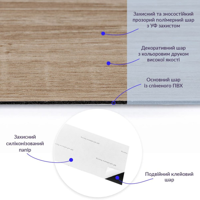 • Захисний силіконізований папір – оберігає клейовий шар від пересихання та забруднення, легко знімається під час монтажу.