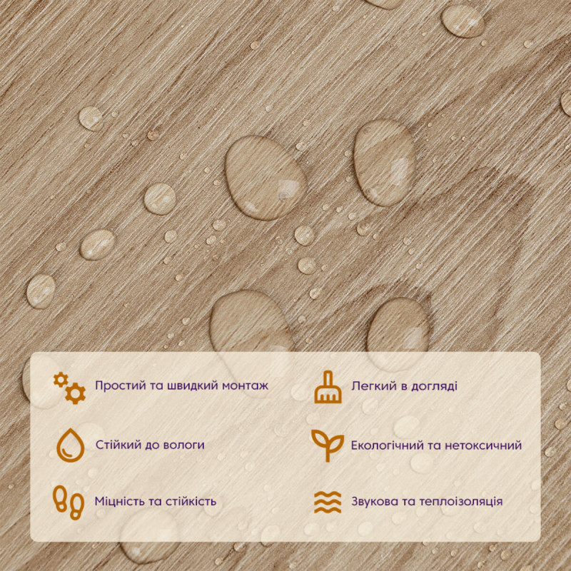 • Екологічна безпека: вінілова плитка під ламінат не містить токсичних речовин і виготовляється з відновлювальних ресурсів, що робить її безпечною для здоров'я та довкілля.