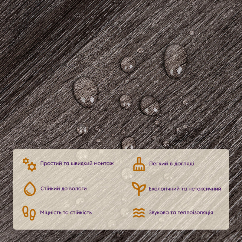 • Екологічна безпека: вінілова плитка під ламінат не містить токсичних речовин і виготовляється з відновлювальних ресурсів, що робить її безпечною для здоров'я та довкілля.