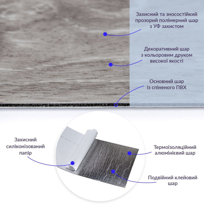 • Захисний силіконізований папір – оберігає клейовий шар від пересихання та забруднення, легко знімається під час монтажу.