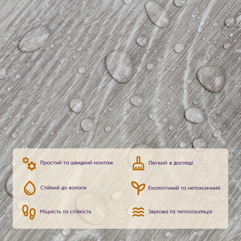 • Стійкість до вологи: вінілова плитка під ламінат стійка до вологи, що робить її відмінним вибором для кухні та інших приміщень з підвищеною вологістю, матеріал стійкий також до впливу пари та до появи плісняви.