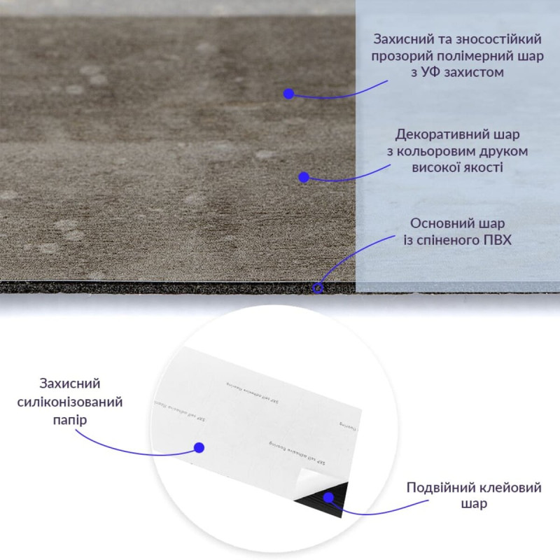 • Захисний силіконізований папір – оберігає клейовий шар від пересихання та забруднення, легко знімається під час монтажу.