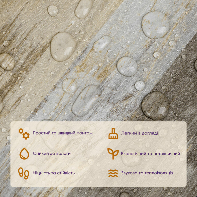 • Екологічна безпека: вінілова плитка під ламінат не містить токсичних речовин і виготовляється з відновлювальних ресурсів, що робить її безпечною для здоров'я та довкілля.
