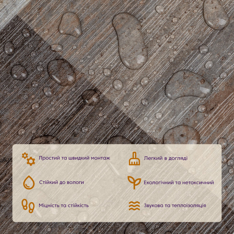 • Екологічна безпека: вінілова плитка під ламінат не містить токсичних речовин і виготовляється з відновлювальних ресурсів, що робить її безпечною для здоров'я та довкілля.