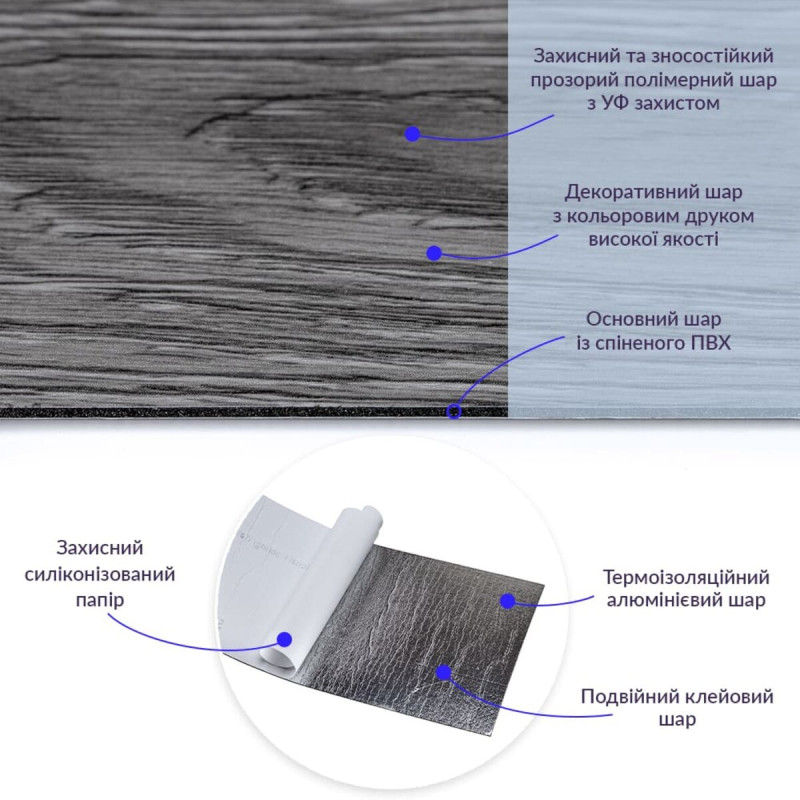 • Фольгований шар: основна властивість цього шару – відображення теплових хвиль, що дозволяє мінімізувати теплові втрати, тим самим покращити теплоізоляцію приміщення.