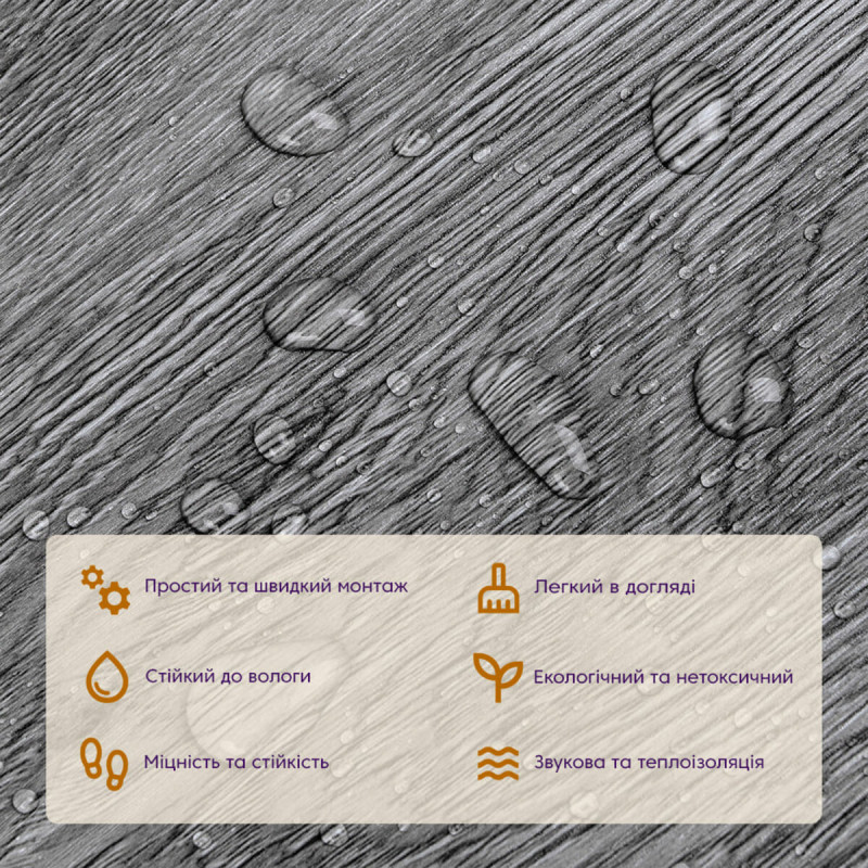 • Екологічна безпека: вінілова плитка під ламінат не містить токсичних речовин і виготовляється з відновлювальних ресурсів, що робить її безпечною для здоров'я та довкілля.