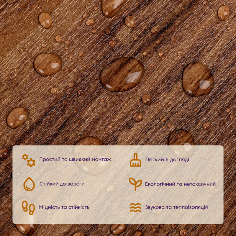 • Екологічна безпека: вінілова плитка під ламінат не містить токсичних речовин і виготовляється з відновлювальних ресурсів, що робить її безпечною для здоров'я та довкілля.