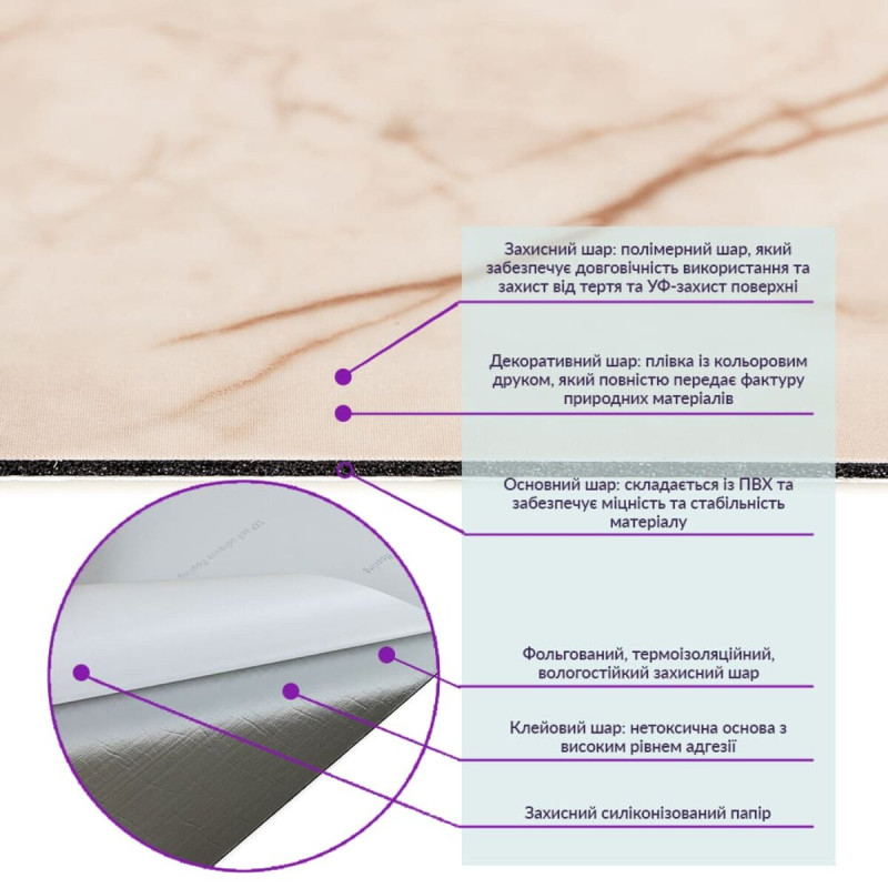 - Захисний силіконізований папір: оберігає клейовий шар від пересихання та забруднення, легко знімається під час монтажу.