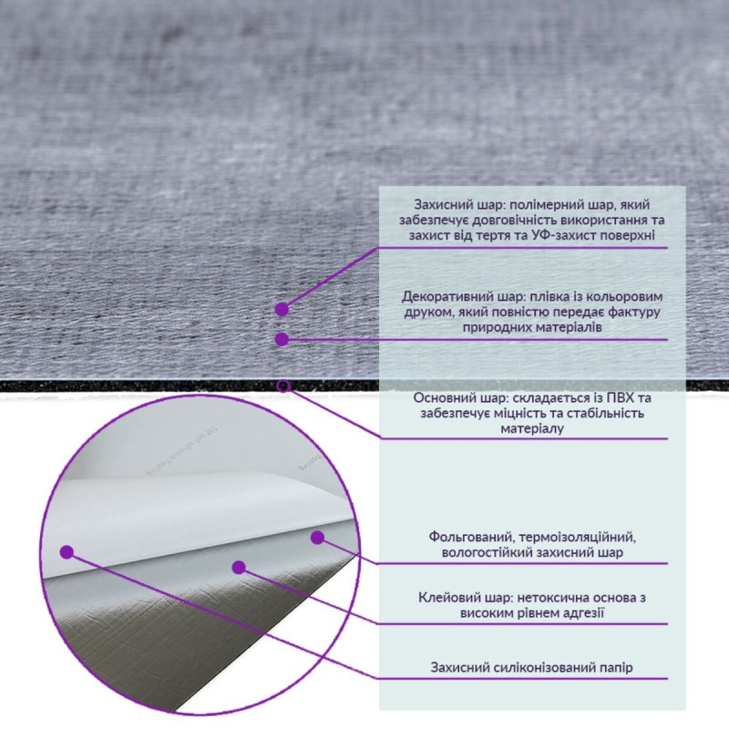 1. Полімерний шар: захищає від потертостей та дрібних механічних пошкоджень, забезпечує довговічність використання, а УФ захист допомагає запобігти вигоранню, зберігаючи колір насиченим.
