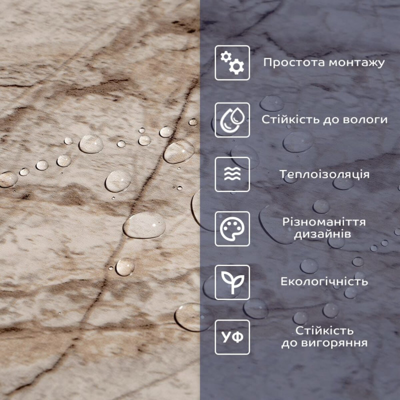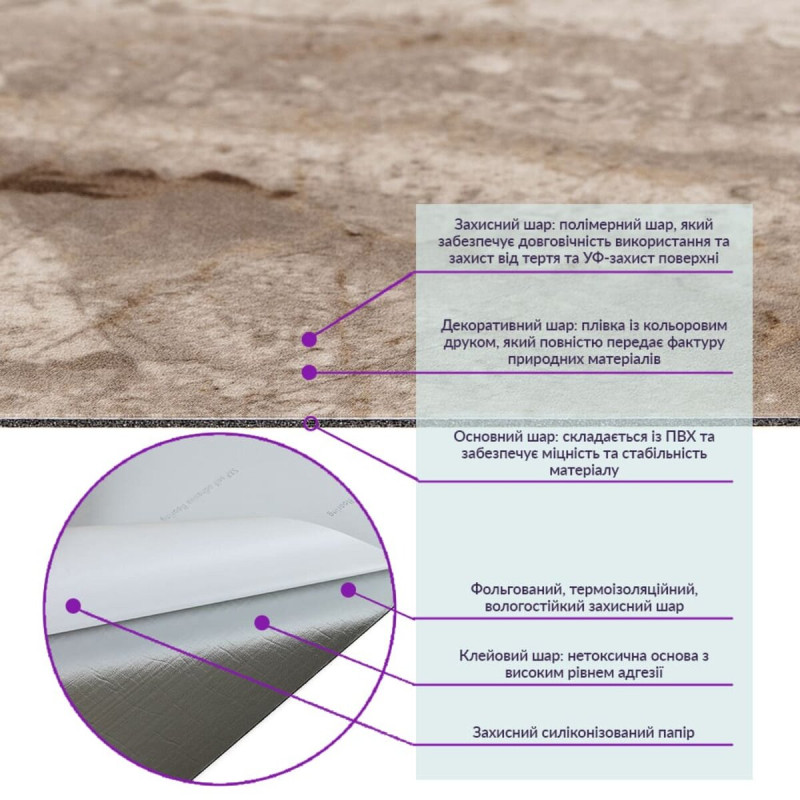 - Полімерний шар: захищає від потертостей та дрібних механічних пошкоджень, забезпечує довговічність використання, а УФ захист допомагає запобігти вигоранню, зберігаючи колір насиченим.
