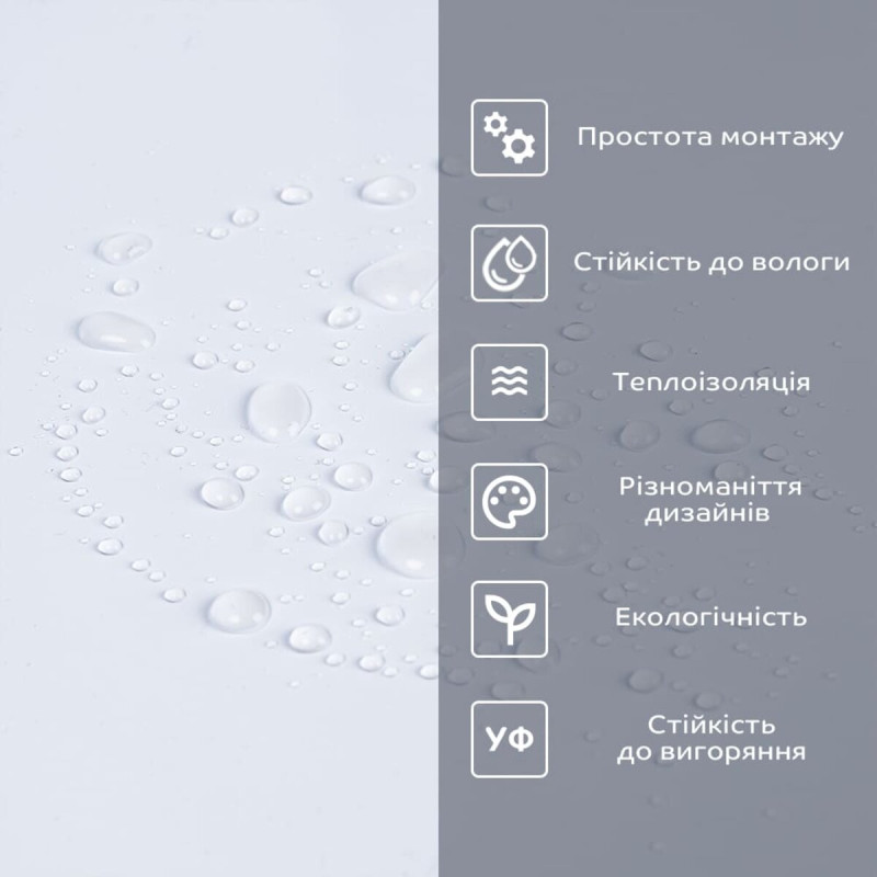 Стійкість до вологи: вінілова плитка в рулоні вологостійка, що робить її відмінним вибором для ванних кімнат, кухні та інших приміщень з підвищеною вологістю, матеріал стійкий також до впливу пари та появи цвілі. Плитка підходить для створення фартуха кухні, можна клеїти біля плити на відстані не менше ніж 30-50 см;