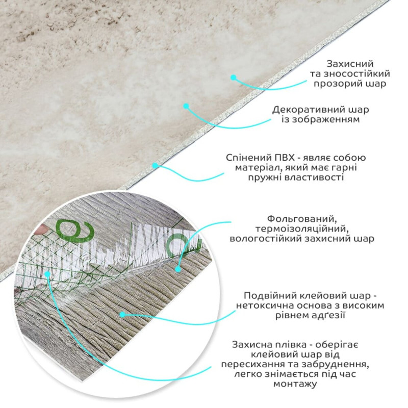 • Декоративний шар: плівка з кольоровим друком високої роздільної здатності, яка повністю імітує фактуру природних матеріалів завдяки чіткому та детальному зображенню.