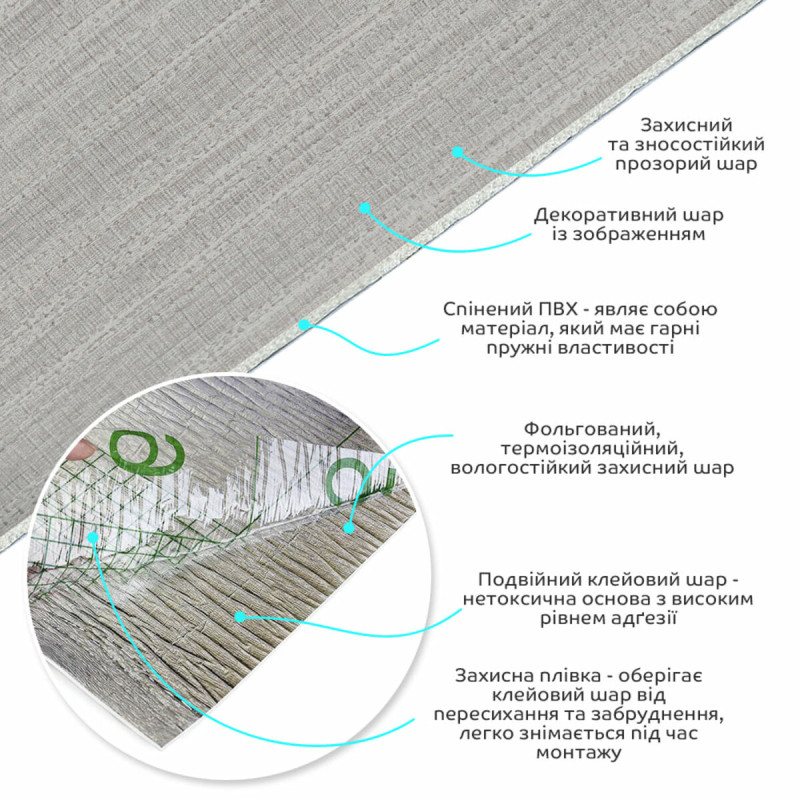 • Декоративний шар: плівка з кольоровим друком високої роздільної здатності, яка повністю імітує фактуру природних матеріалів завдяки чіткому та детальному зображенню.