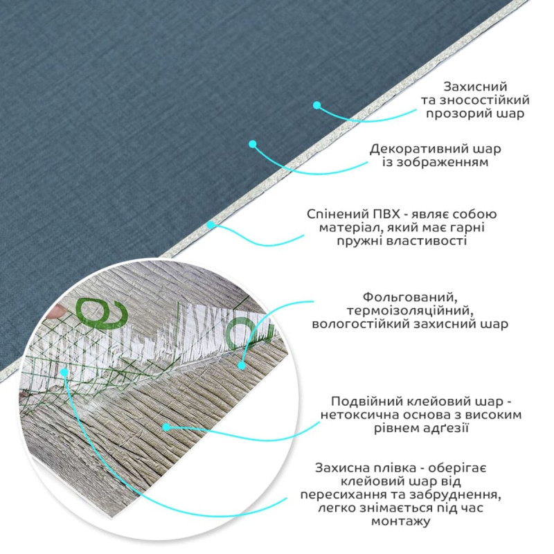 • Декоративний шар: плівка з кольоровим друком високої роздільної здатності, яка повністю імітує фактуру природних матеріалів завдяки чіткому та детальному зображенню.