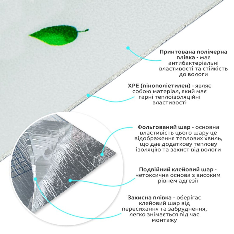 - Захисна плівка: оберігає клейовий шар від пересихання та забруднення, легко знімається під час монтажу.