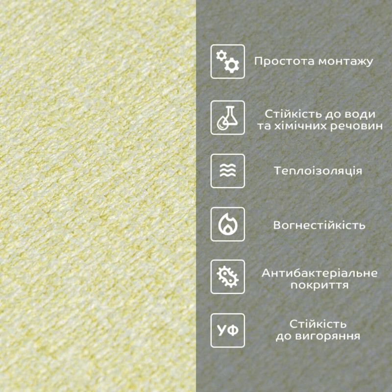 - Прінтована полімерна плівка - має антибактеріальні властивості, стійкість до вологи, хімічних речовин і температури. -захист допомагає запобігти вигоранню, зберігаючи колір насиченим, за рахунок чого шпалери довго зберігають свій первісний естетичний вигляд