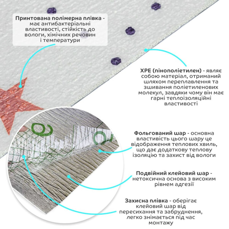 - Теплоізоляція: Спінений ХРЕ і фольгований шар забезпечують хорошу теплоізоляцію, що допомагає підтримувати комфортну температуру в приміщенні.