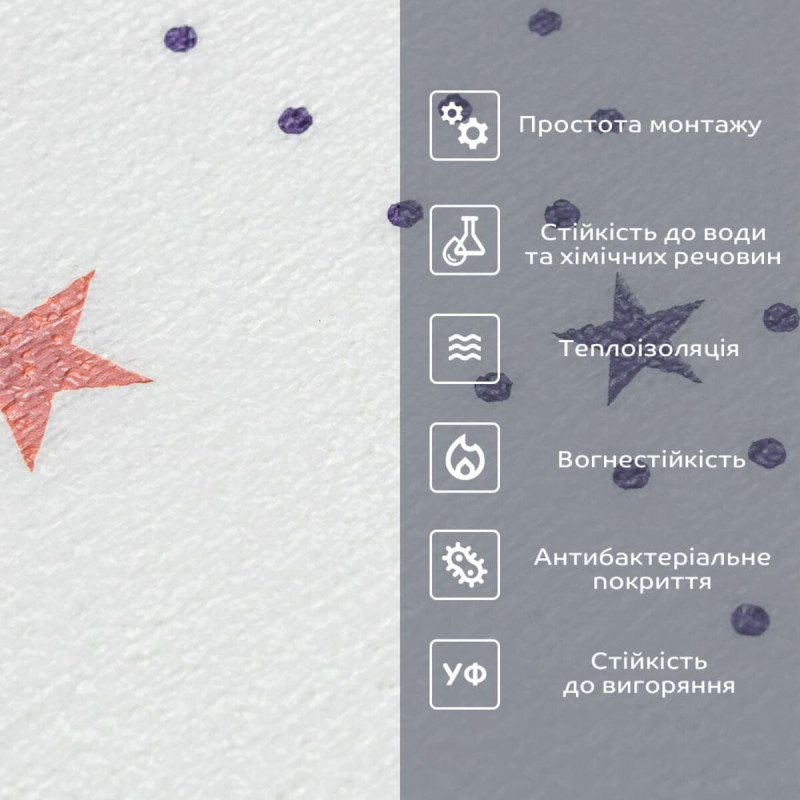 - Прінтована полімерна плівка - має антибактеріальні властивості, стійкість до вологи, хімічних речовин і температури. -захист допомагає запобігти вигоранню, зберігаючи колір насиченим, за рахунок чого шпалери довго зберігають свій первісний естетичний вигляд