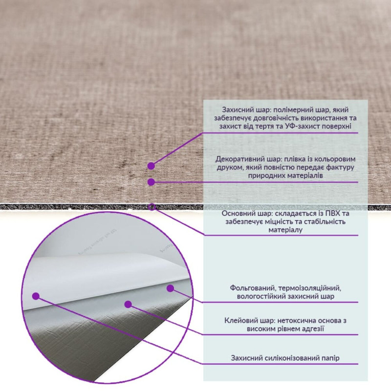 - Полімерний шар: захищає від потертостей та дрібних механічних пошкоджень, забезпечує довговічність використання, а УФ захист допомагає запобігти вигоранню, зберігаючи колір насиченим.
