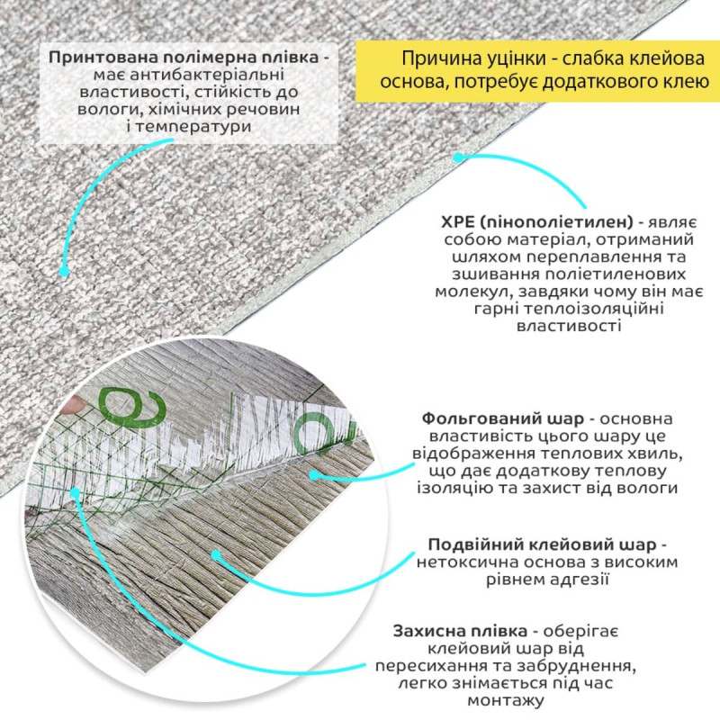 - Захисна плівка: оберігає клейовий шар від пересихання та забруднення, легко знімається під час монтажу.