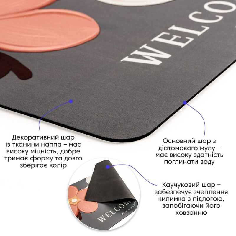 • Каучуковий шар – забезпечує зчеплення килимка із підлогою, запобігаючи його ковзанню на гладких або слизьких поверхнях.