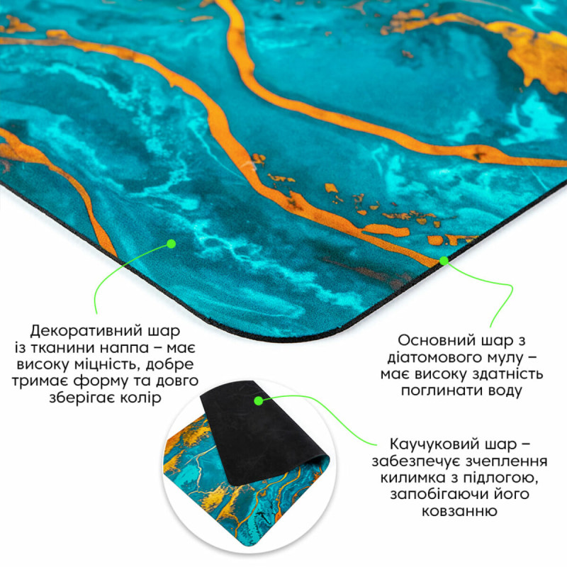 Каучуковий шар – забезпечує зчеплення килимка із підлогою, запобігаючи його ковзанню на гладких або слизьких поверхнях.