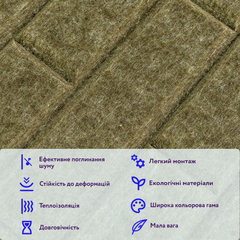 Самоклеючі звукоїзоляційні панелі –це багатошаровий оздоблювально-функціональний матеріал, призначений для зниження рівня шуму та покращення акустики приміщення. Основу панелей становить пресований поліефірний войлок, який забезпечує ефективну звуко- й додаткову теплоізоляцію, поєднуючи легку вагу з високою стійкістю до деформацій. Завдяки клейовому шару панелі швидко монтуються, а однотонна поверхня з виразним 3D-ефектом (під рейку або цеглу) поєднує технічні властивості з сучасним декоративним виглядом.